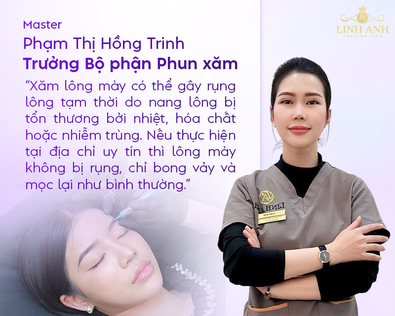 Master Phạm Thị Hồng Trinh – Trưởng phòng Phun xăm tại Thẩm mỹ Quốc tế Linh Anh, với gần 10 năm kinh nghiệm đã chia sẻ rằng: “Xăm lông mày có thể gây rụng lông tạm thời nếu sử dụng mực xăm kém chất lượng, kỹ thuật phun xăm yếu kém, chăm sóc sai cách.